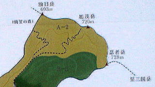 当日戴いた西内正弘氏のガイドのコピー(2冊目に収録予定のコースだがまだ未刊)によると加茂岳・忍者岳のピークはいずれも三重側に少し入ったところにあり縦走路ではないようである。このコースを歩くときは探してみるのも面白そうである