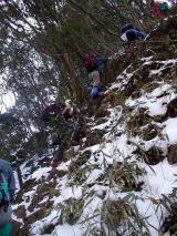 三国岳手前鞍部は滑りやすい岩場だが枝や根っ子があるので助かる。