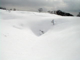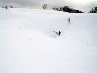 雪原には数人の踏み跡があるがまだ雪が締まっていないので