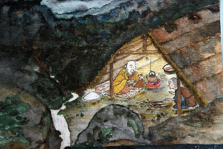 | ここで休憩してスタミナ補給 | 小屋の中には蓮如上人の絵が掛けられていた |