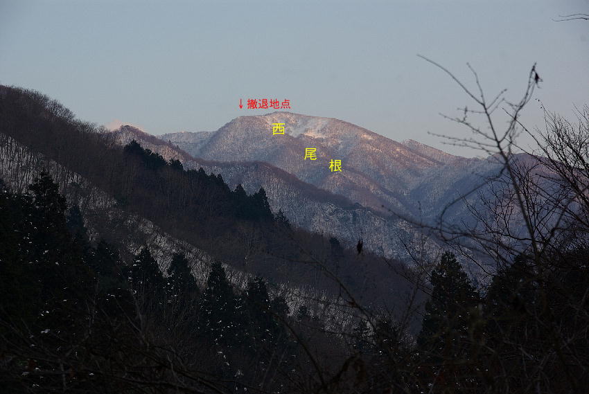岩ヶ谷林道途中で振り向くと登った西尾根上部が雲もなく赤く光っていた。
