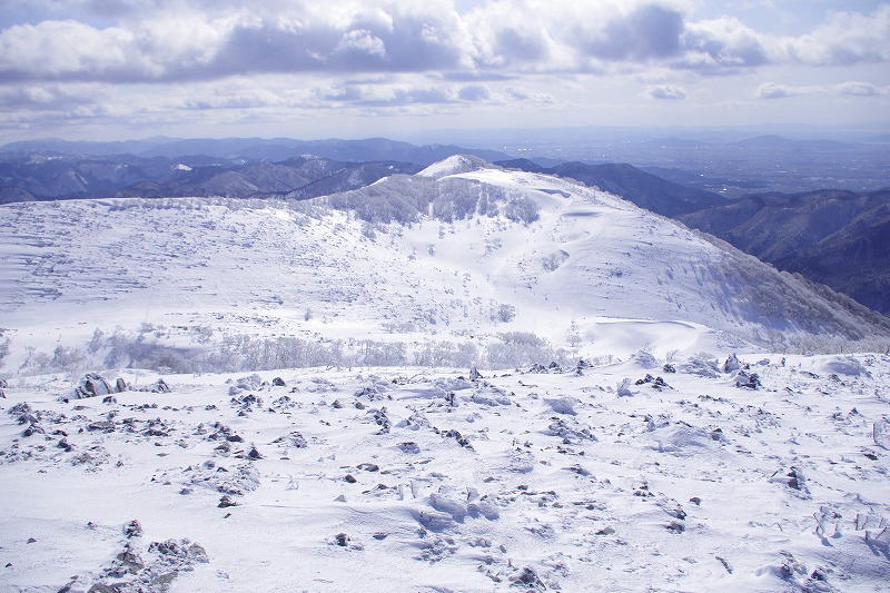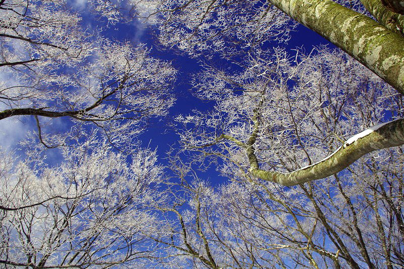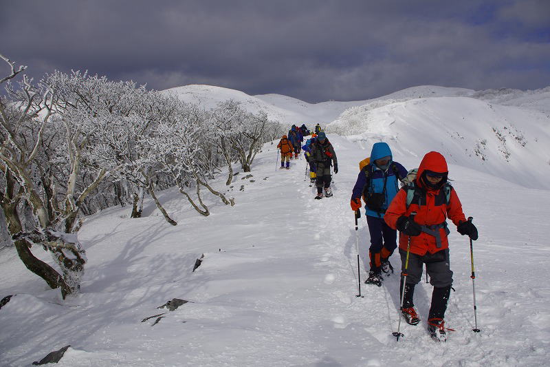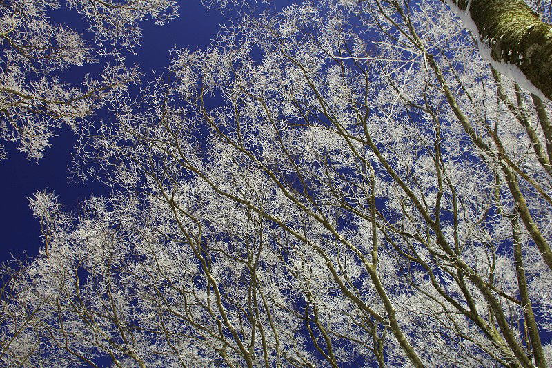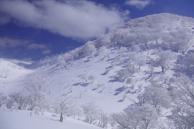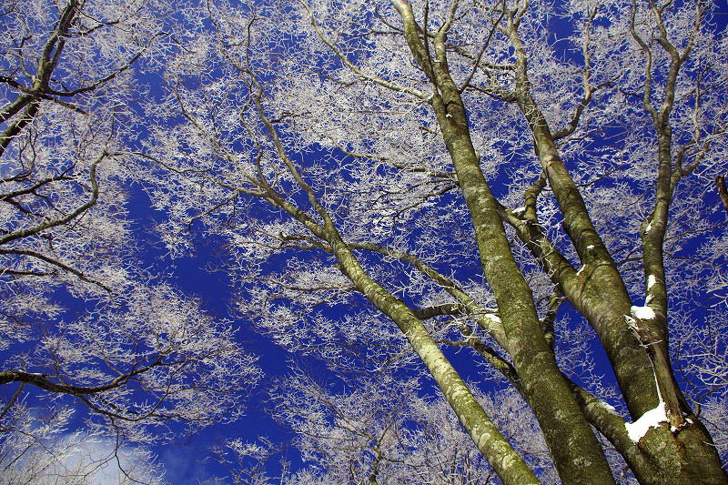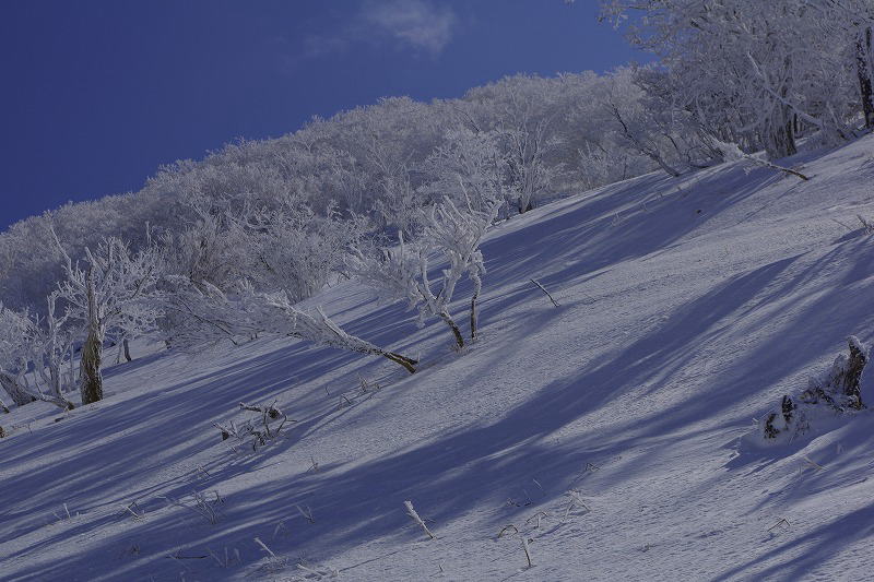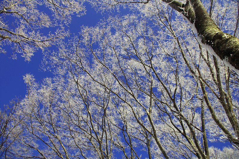 | 汗拭き峠を経て見晴らし台辺りより早くも霧氷の大歓迎 |