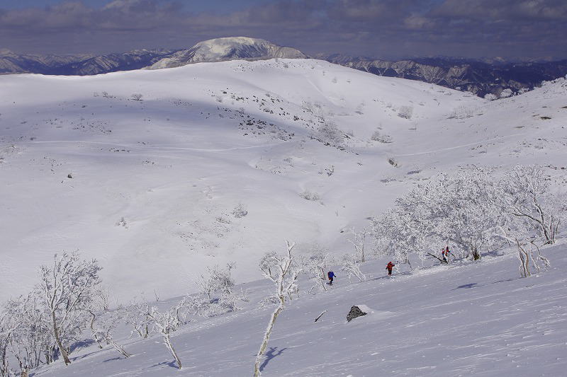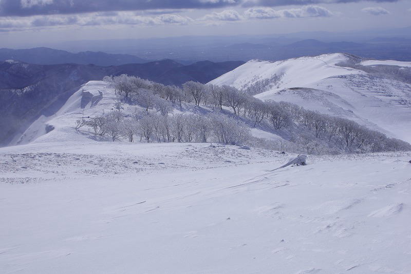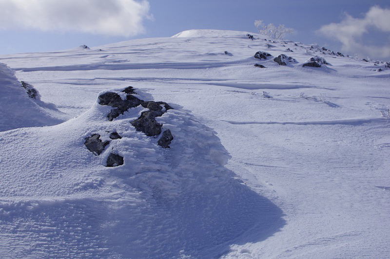 | この辺りはゆるい傾斜 風で雪が飛ばされ地肌が露出 |