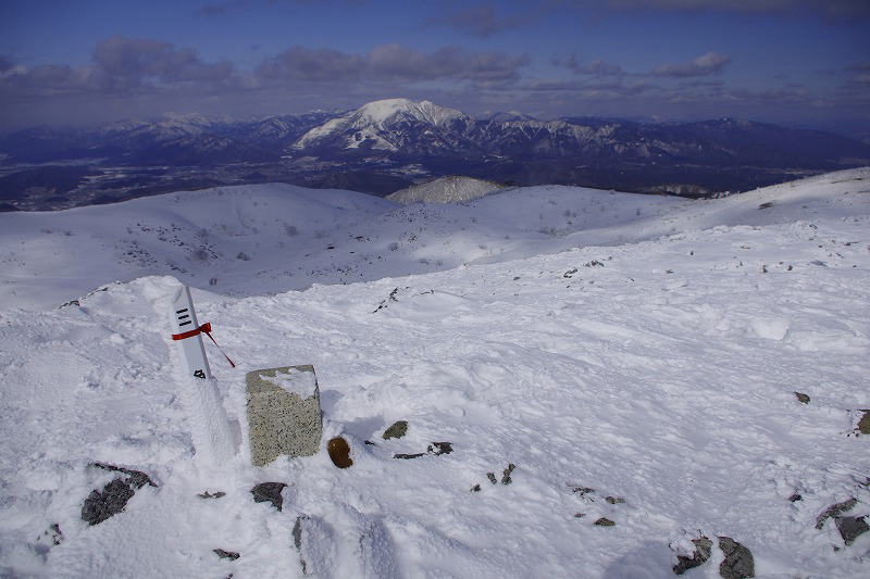 | 山頂部に着くとお猿岩も雪に埋まり行方不明 これから三角点西のピーク経由で山頂へ |